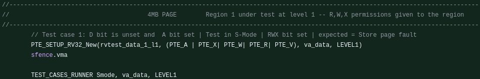 - Begin the test in M-Mode and configure a Page Table Entry (PTE) for the target region, referring to it as rvtest_data_1_l1 for the level 1 test case and rvtest_data_1_l0 for the level 0 test case.