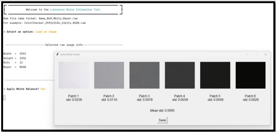 The Luminance Noise Estimation module is designed to assist users in estimating luminance noise levels in an RGB image by locating a ColorChecker. The analysis involves evaluating the statistical characteristics of the pixel values within the gray patches. By examining the variances or standard deviations of these pixel values, the algorithm gains insights into the degree of noise affecting the luminance channel.